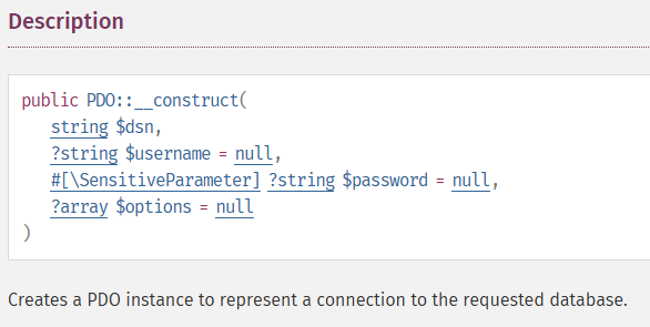 즉, 데이터베이스에 연결하기 위한 정보들을 담는 문자열인 것이다. PDO_MYSQL DSN 공식 문서를 참고하면 이 `$dsn` 자리에 어떠한 문자열이 와야하는지 알 수 있다.