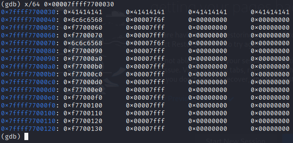 Looking at the values as much as 256 bytes from 0x00007ffff7700030 where'hello' is stored,
