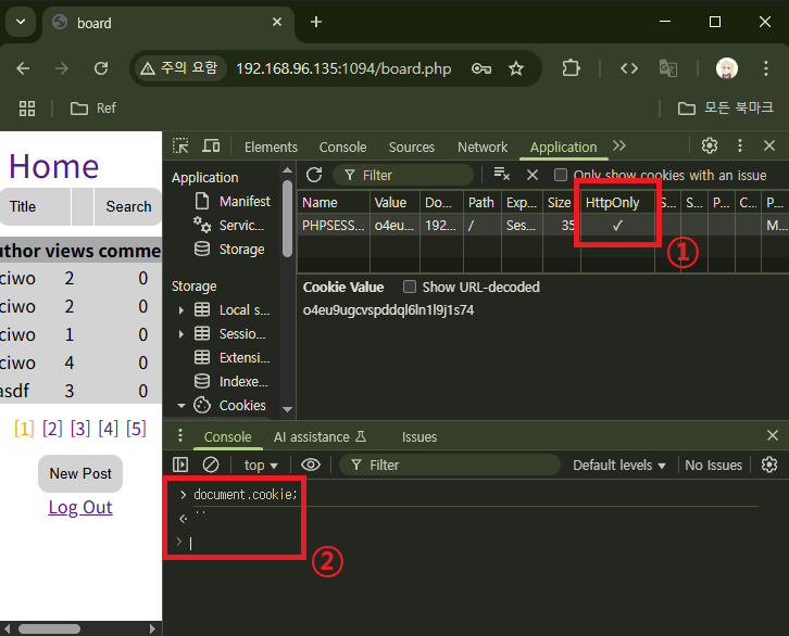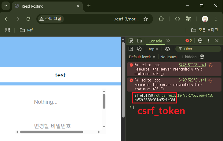 위의 내용을 담은 글을 작성하면 글을 읽는 순간 콘솔 창에 어떠한 문자열이 출력될 것이다. 그리고 그 문자열이 바로 csrf_token이 될 것이다.