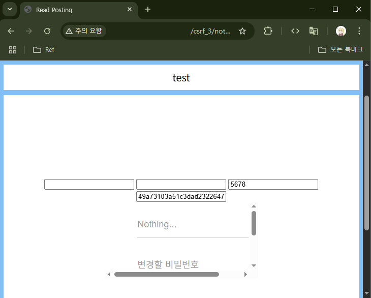 글을 읽어보면 수상해보이는 <input>이 좀 보이긴 한다.. 일단 로그아웃하고 비밀번호가 정상적으로 `5678`로 변경됐는지 확인해보겠다.