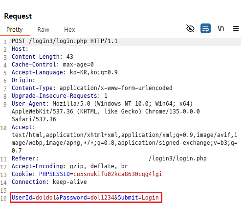 마지막 3번째 문제도 설명은 변한 것이 없다. 이번 문제 또한 겉보기에는 딱히 변한 것이 없어보이지만, mypage.php 페이지에서 회원정보를 수정해 mypage_update.php로 요청을 보내면 다음과 같은 패킷을 확인할 수 있다.