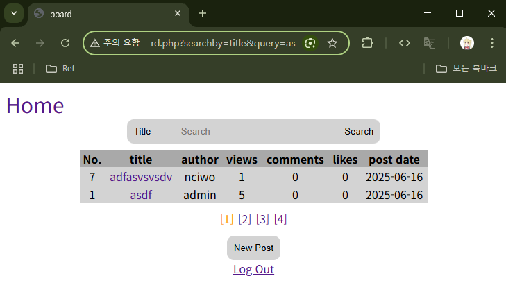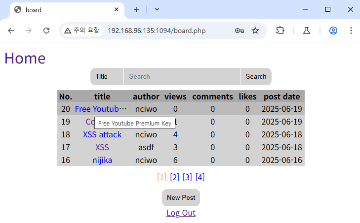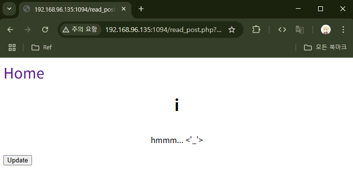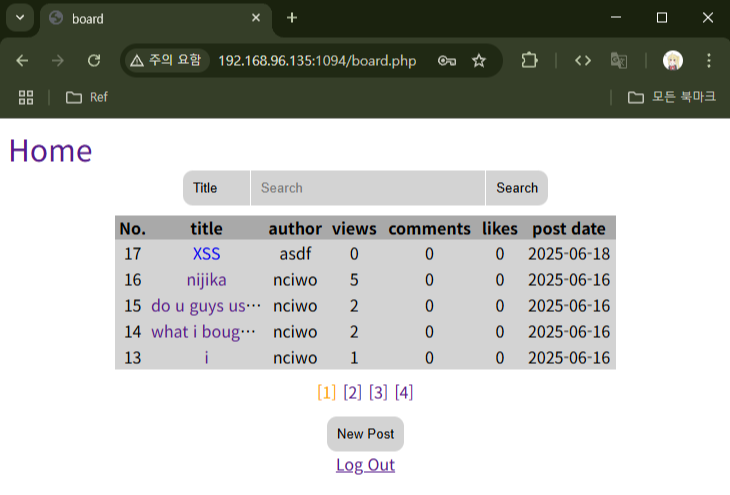 글에 들어가보니 깨진 이미지 아이콘이 보인다. 로그아웃한 뒤, 원래 ID, PW인 `nciwol`, `nciwo`로 로그인해보겠다.