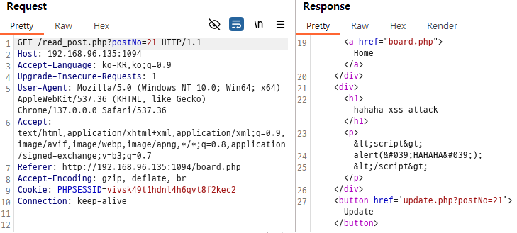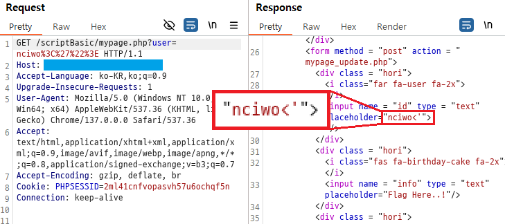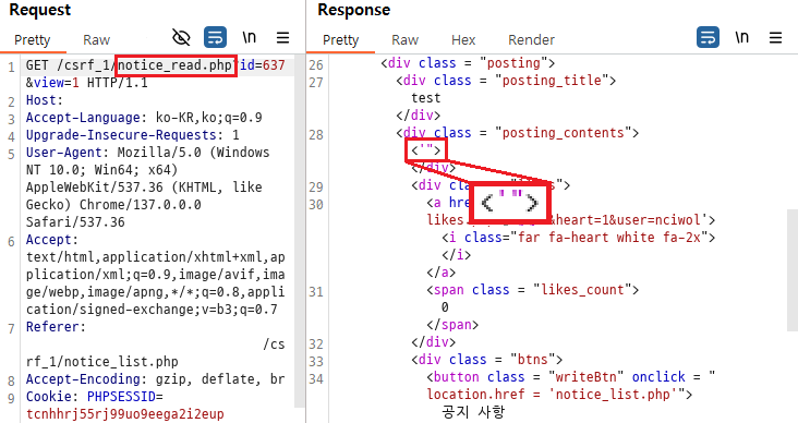 이번에도 notice_read.php 페이지에서 XSS 취약점을 찾았다. <img> 태그를 이용해서 mypage_update.php에 접속하도록 Stored XSS를 시도해보겠다.