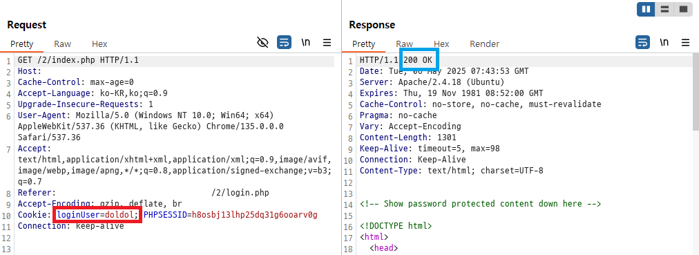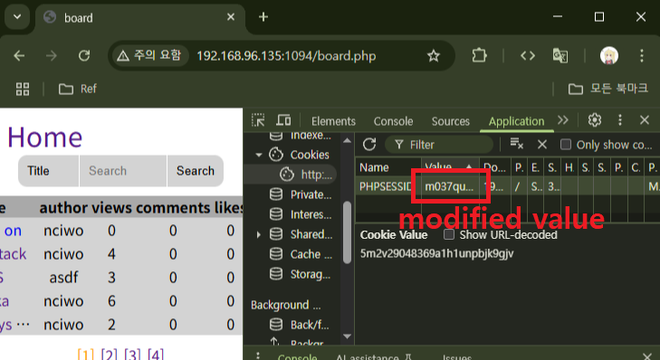 `5678`로 시도하니 로그인이 됐다. 즉, 아까 작성한 글에 의해 비밀번호가 `5678`로 바뀌었다는 것이다.