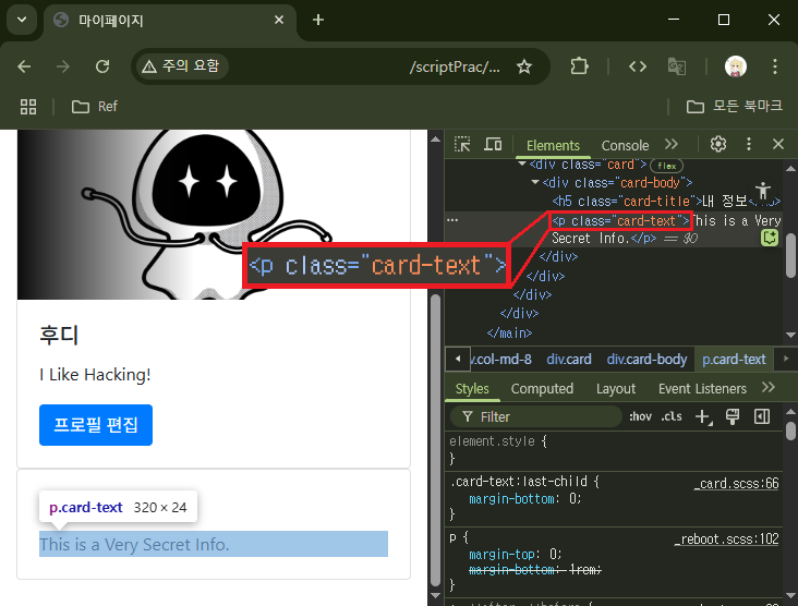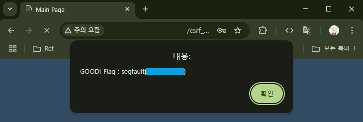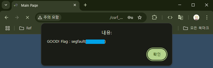 멀지 않은 곳에서 해당 토큰 값을 찾아낼 수 있었다. mypage.php 페이지를 받아올 때 애초에 숨겨진 <input> 태그의 value로 들어가있었다. 이런 토큰을 사용하면 POST 요청만을 받았을 때처럼 CSRF 단독으로 하는 공격이 불가능해진다. 하지만 여전히 XSS와 함께 하는 CSRF에는 취약하다.