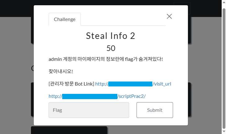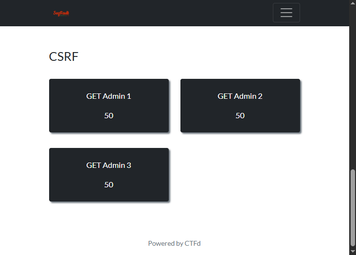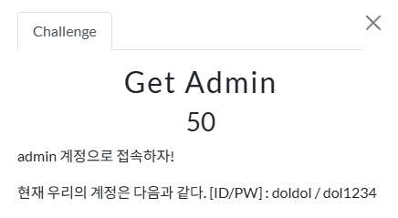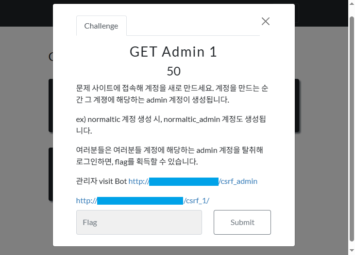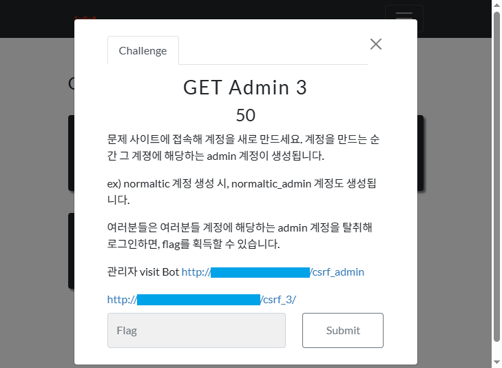 `GET Admin 1` -> `GET Admin 2` -> `GET Admin 3` 순으로 푼다. 이번 문제는 CSRF 공격을 이용하게 된다.