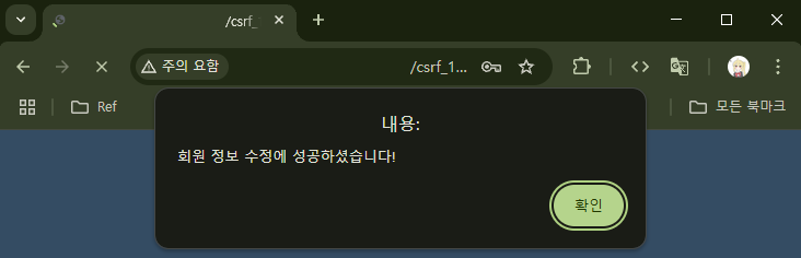 링크를 클릭했더니 "회원 정보 수정에 성공하셨습니다!"라는 문구가 출력된다. 누가 봐도 수상하다. 사용자는 이 사실에 대해 즉시 운영자에게 알리거나, 여전히 회원정보 수정이 가능한 상태라면 원래의 비밀번호로 되돌려놓을 것이다.