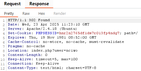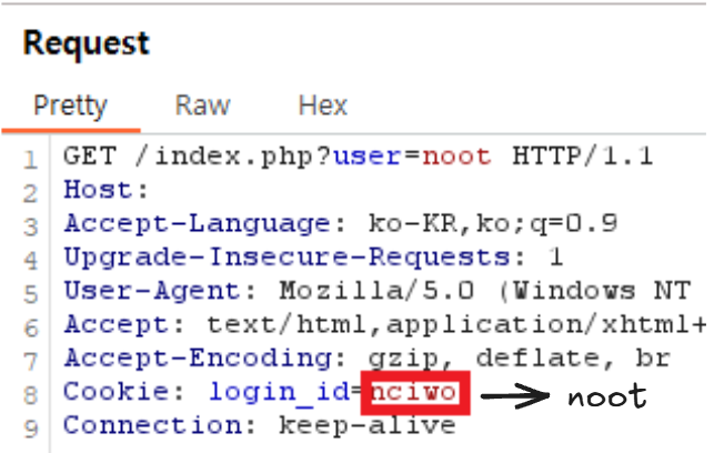 `Cookie: login_id='nciwo', GET index.php?id=nciwo` 서버에게 login_id에 해당하는 쿠키 값으로 nciwo를 보여주며, 유저 정보 페이지를 요청한다.