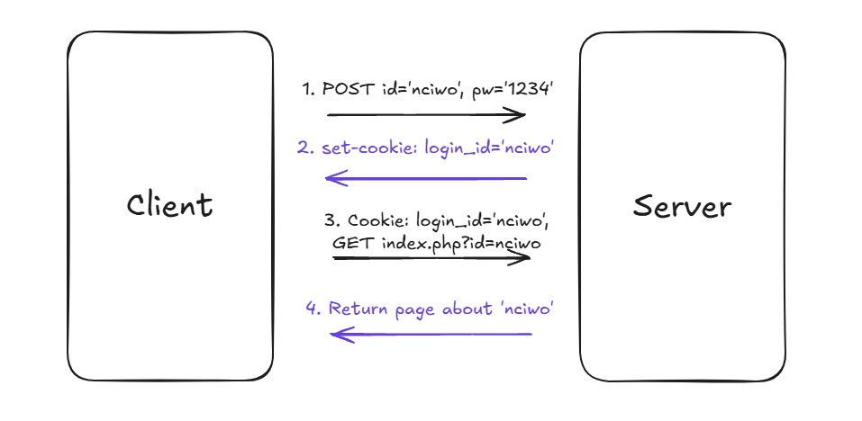 `set-cookie: login_id='nciwo'` 해당 ID-PW에 해당하는 유저 정보를 확인한 뒤, 클라이언트에게 login_id의 값이 nciwo인 쿠키값을 전달한다.